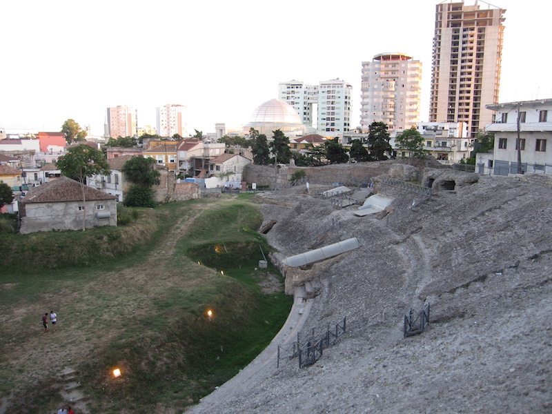 Auf der Rückfahrt nach Durrës verpassten wir wiederum mangels Beschilderung die Auffahrt auf die Autobahn, haben aber mittels Nachfrage an einer Tankstelle – dieses Mal auf Englisch – den Weg bald gefunden. Nach einer Siesta und einem Cappuccino machten wir uns dann zum archäologischen Highlight von Durrës auf, dem römischen Amphitheater. 1966 wurde es nur durch Zufall entdeckt, als ein Bewohner der Stadt seinen Garten umgraben wollte. Zur Zeit Kaiser Hadrians im Anfang des 2. Jahrhunderts nach Christus errichtet, konnte es auf Grund der heutigen Bebauung nicht ganz freigelegt werden. Aber im unterirdischen Bereich lassen sich sowohl der Ausgang für die Gladiatoren als auch die Verließe für die Gefangenen und die wilden Tiere noch gut ausmachen.