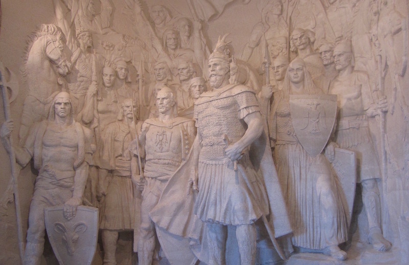 Durch eine schmale Basargasse gelangten wir zur Burg, von der allerdings nur noch Reste vorhanden sind. In sie hinein gebaut ist ein Museum mit monumentaler Fassade für den Nationalhelden Skanderbeg. Entworfen hat es Pramvera Hoxha, die Tochter Enver Hoxhas, der Albanien von 1946 bis zu seinem Tod 1985 als kommunistischer Diktator beherrschte. Als wir eintraten, blickten wir gleich auf eine Gruppe von Kämpfern, die den Helden Skanderbeg und seine Lieblingsschwester Mamica umringen. Im Museum haben uns einige Exponate interessiert (zumeist sind es allerdings Nachbildungen). Vor allem begeisterte uns aber die Terrasse mit einem grandiosen Ausblick auf die fruchtbare Ebene bis zum Meer und die Hügelketten bis hin zu den Bergen jenseits des Skutari-Sees.