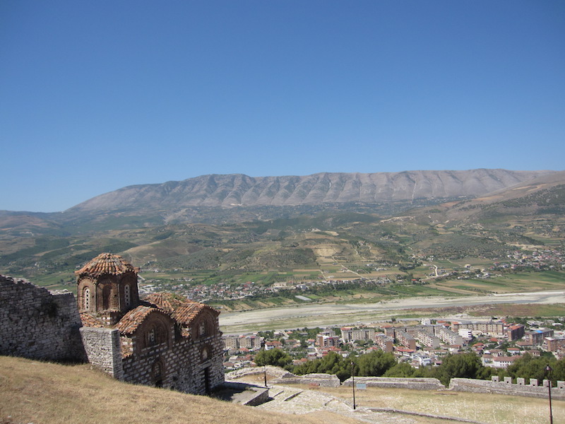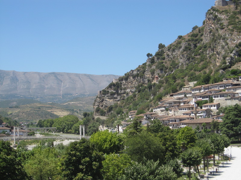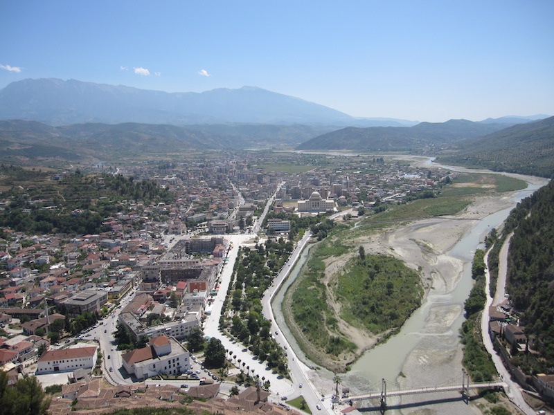 Am anderen Morgen galt es auszuchecken. Und nachdem einer von uns dabei seine Kreditkarte verbaselt und wiedergefunden hatte, brachen wir nach Berat auf, der Stadt im Tal des Osum-Flusses mit dem Tomorr-Gebirge im Hintergrund. Wir erreichten sie kurz vor Mittag, nachdem wir wieder ein paar Orientierungsprobleme gelöst hatten.