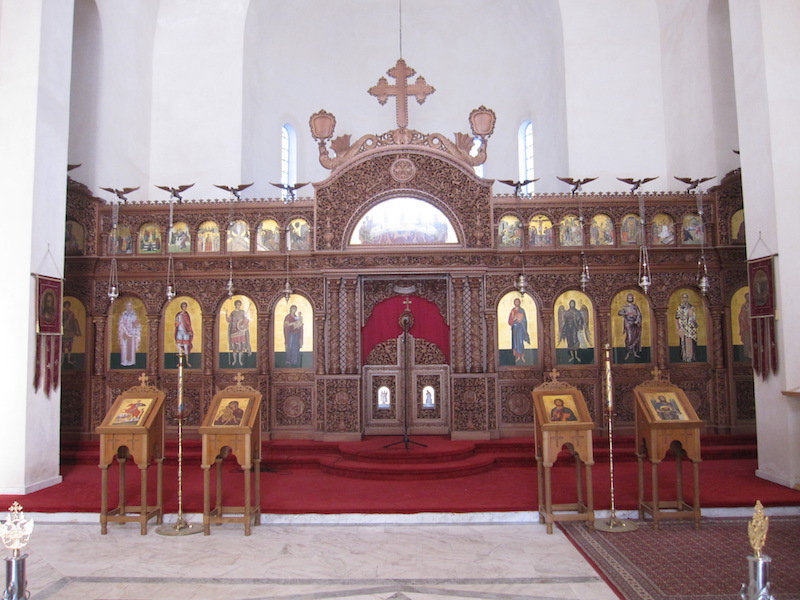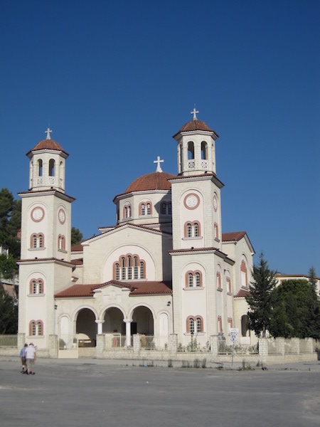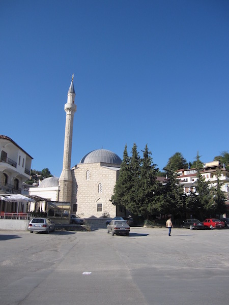 Nach Bezug der Zimmer begaben wir uns in ein vom freundlichen Hotelportier empfohlenes nahegelegenes Lokal, um ein kleines Mittagsmahl einzunehmen. Nach einer wegen der hohen Temperaturen etwas großzügiger bemessenen Siesta erkundeten wir den Stadtteil Mangalem am rechten Osum-Ufer. In osmanischer Zeit war er den moslemischen Bewohnern vorbehalten. Heute erhebt sich dort in unmittelbarer Nachbarschaft zur großen Bleimoschee (Xhamia e Plumbit) mit ihrem hohen Minarett die orthodoxe Kathedrale (Shën Dhimitrit), in der uns ein älterer Herr manches Wissenswerte zum Interieur nahebrachte.