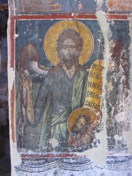 In der Kirche lenkte Elvis unseren Blick zunächst auf ein medaillonartiges Ornament, das auf die jüdischen Wurzeln des christlichen Glaubens verweist. Dann erläuterte er die am besten erhaltenen Fresken: ein Bildnis Johannes des Täufers und einen Festtagszyklus mit dem Tod Mariens, Darstellungen der Passion Christi sowie Medaillons mit verschiedenen Heiligen. Dabei zeigte Elvis ein sehr großes Wissen hinsichtlich der christlichen Ikonographie, das uns fragen ließ, ob er denn christlich erzogen worden sei. Er sei Sohn eines orthodoxen Vaters und einer muslimischen Mutter. Solche Verbindungen seien unter dem Hoxha-Regime sehr häufig angeordnet worden vom örtlichen Parteisekretär, wenn dieser mitbekommen habe, dass eine gewisse Zuneigung zwischen zwei jungen Leuten bestand. Erzogen worden sei man dann als Kind in der Religion des Vaters, soweit das unter den damaligen Umständen überhaupt möglich gewesen sei.