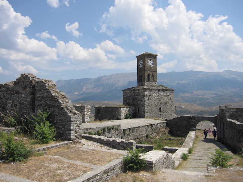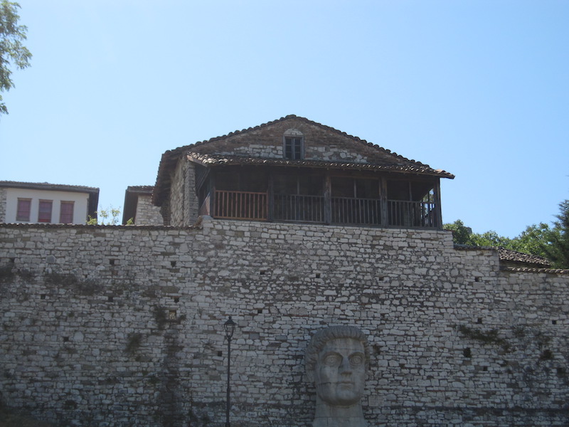 Zunächst geht es hinauf zur Burg, deren Grundmauern im 3. Jahrhundert vor Christus von den Illyrern aufgerichtet worden sind. Von den Byzantinern Jahrhunderte später weiter ausgebaut erhielt die Festung erst durch Ali Pascha zu Beginn des 19. Jahrhunderts ihre heutige Ausdehnung. Mächtig öffnete sich vor uns die große Galerie mit italienischen und deutschen Geschützen, die im 2. Weltkrieg von den albanischen Partisanen – an diese erinnert dort ein Denkmal – erbeutet wurden. Auch auf dem Außengelände treffen wir auf verschiedene Beutestücke und auf eine große Bühne, die seit 1980 für das alle vier Jahre stattfindende internationale Folk-Festival genutzt wird. Sodann zogen der Uhrturm aus dem 19. Jahrhundert und die Bastionen unterhalb desselben unsere Aufmerksamkeit auf sich. Demgegenüber sparten wir das Waffenmuseum und das Gefängnis für die Gegner des kommunistischen Regimes aus und genossen stattdessen die grandiosen Aussichten auf die Stadt.
