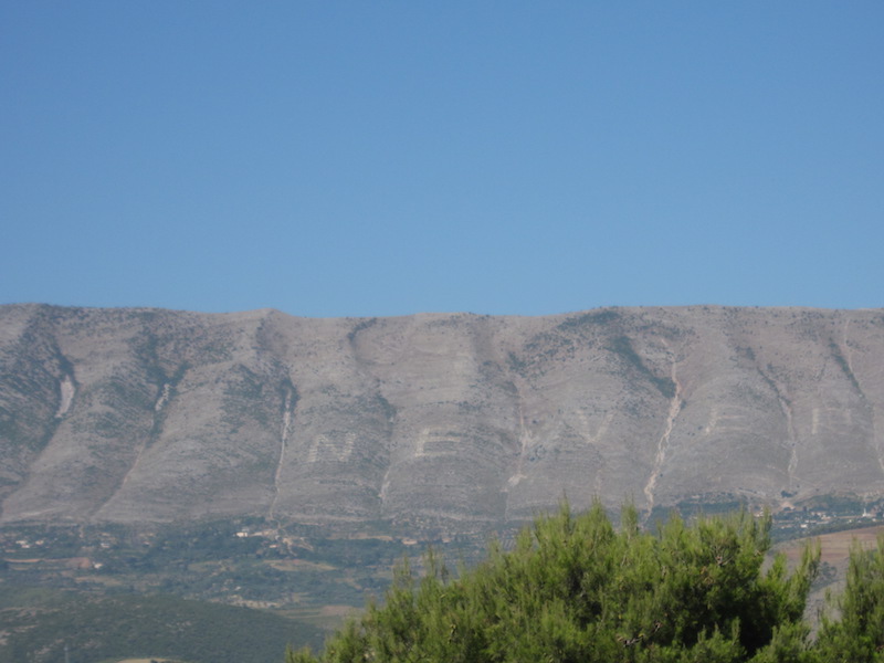 Dann ging es in die Kirche des Shën Kollit. Dort galt es weitere Fresken zu bewundern. Anschließend wandten wir uns der Dreifaltigkeitskirche zu, einer schönen Kreuzkuppelkirche. Vor ihr stehend hatten wir einen herrlichen Blick auf das gegenüber liegende Gebirge und das Osum-Tal. Da fiel uns der Schriftzug „NEVER“ auf dem Gebirgsrücken auf und, ehe wir seine Bedeutung erfragen konnten, setzte Elvis zur Erläuterung an. Während der Diktatur habe Hoxha an allen möglichen Stellen seinen Vornamen platzieren lassen: ENVER. Nach der Befreiung habe man dann, wo es möglich gewesen sei, aus Enver NEVER gemacht: NIEMALS. Niemals wieder eine solche Diktatur!