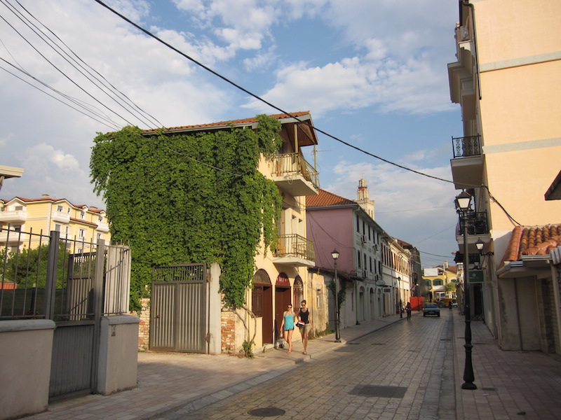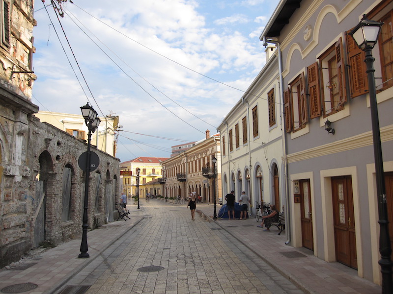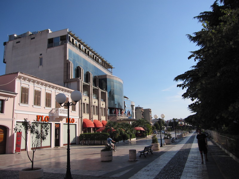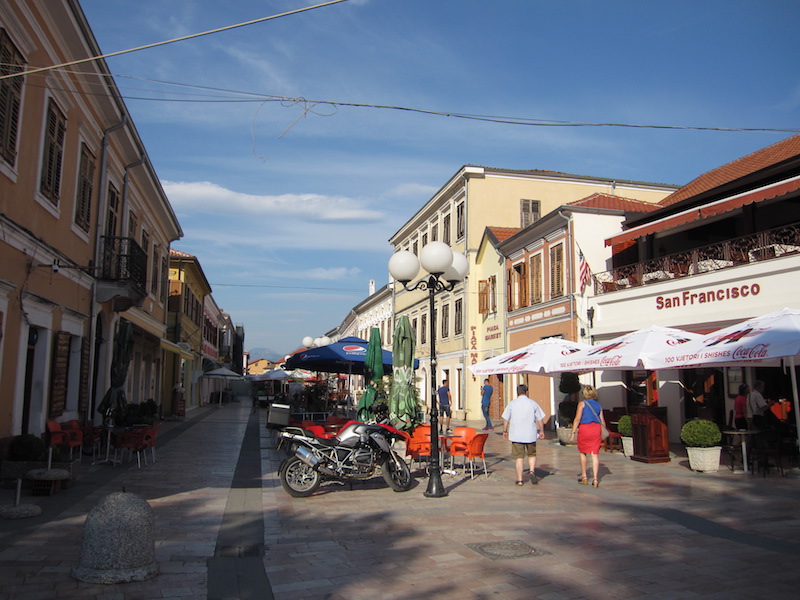 Die Brücke führte uns in den Stadtteil Gorica, der früher vor allem von orthodoxen Christen (meist griechischer Herkunft) und von Juden bewohnt wurde. Leider war die Kirche des Hl. Spiridon, das Zentrum des Viertels, als wir dort eintrafen, gerade geschlossen worden. So gingen wir Abendessen und danach suchten wir noch einmal unsere Mittagskneipe auf, um das von uns bevorzugte Korçë-Bier als Nachttrunk zu uns zu nehmen. Dabei konnten wir im Gegensatz zur menschenleeren Fußgängerzone am Mittag nunmehr am Abend einen Boulevard erleben, der von flanierenden Gruppen aller Altersstufen belebt wurde – und das bis zum frühen Morgen! Entsprechend schliefen wir in der Nacht mit gewissen Unterbrechungen.