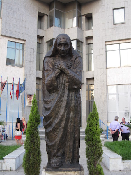 Aus den übrigen Kirchen und auch aus den Moscheen wurden, soweit sie nicht abgerissen wurden, Kinos, Jugendtreffs oder Kunstgalerien. Nur die in den 70-er Jahren des 18. Jahrhunderts erbaute Bleimoschee blieb als kulturell wertvolles Bauwerk erhalten. Jetzt aber konnten wir die Kathedrale in neuem Glanz erstrahlen sehen. Nebenan wohnt der Erzbischof wieder im alten Palais und rings um die Kathedrale bilden kirchliche Häuser „einen kleinen Vatikan“. Lediglich der Platz vor der Kathedrale war noch in Arbeit. Und ein großes Priesterseminar sowie eine katholische Oberschule sind auch wieder eröffnet. Kurz vor unserem Hotel trafen wir dann auf eine Statue der hochverehrten Mutter Teresa, der albanischen Ordensfrau, die mit ihren Missionarinnen der Liebe, wie schon erwähnt, ihr Leben den Ärmsten der Armen in Indien gewidmet hat.