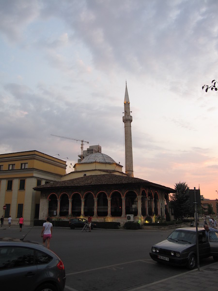Nach einer Siesta im Hotel und einem Cappucino in einem Café ganz in der Fußgängerzone erkundeten wir auf unserem Nachmittagsspaziergang zwei Stadtviertel Shkodërs: Gjuhadol und Serrec. In ersterem lag unser Hotel gegenüber der Ebu-Bekir-Moschee an der restaurierten Prachtstraße Kolë Idromeno.