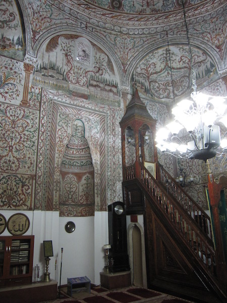 Dann ging’s vorbei an der Oper und dem Nationalmuseum auf den Platz, wo das Reiterdenkmal für den Nationalhelden steht. Gleich in der Nähe erhebt sich die Et’hem Bey Moschee. Neugierig wie ich bin, habe ich mich rasch meines Schuhwerks entledigt und wurde dann auch von einem freundlichen Moslem ins Innere gebeten – die anderen blieben draußen – und zum Fotografieren aufgefordert, was ich denn auch getan habe. Die reiche Ausmalung mit vorrangig floralen Motiven faszinierte mich. Wie ich erfuhr, war sie während der Atheismus-Kampagne Hoxhas von der Öffentlichkeit nicht zu bewundern, wurde aber während dieser sogar restauriert, weil die Moschee unter Denkmalsschutz stand.
