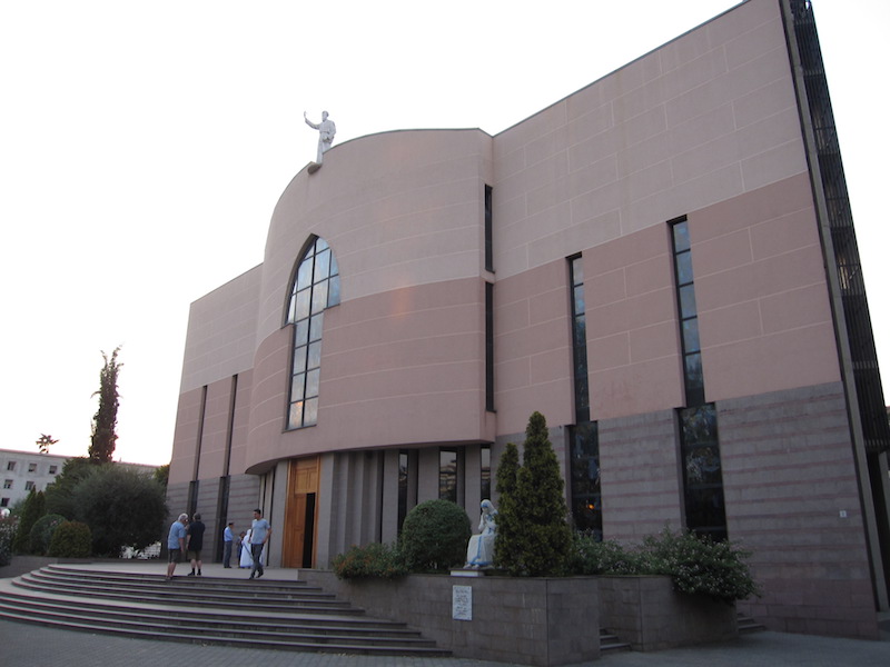 Sonntagmorgens begaben wir uns nach dem Frühstück zur Hl. Messe um 10 Uhr in die Kathedrale, die der Erzbischof zusammen mit einer großen Gemeinde und vielen Akteuren feierte. Alles war ganz anders als eine Woche zuvor in der Diaspora von Vlorë. Unter den Gottesdienstteilnehmern waren alle Altersgruppen vertreten, die meisten sangen aber nicht – es gab auch keine Gesangbücher –, dafür sang ein Chor. Dazu gab es mehrere Kommunionhelfer, Lektoren und Ministranten. Der Erzbischof nahm – so viel konnten wir trotz fehlender Albanisch-Kenntnisse verstehen – in seiner Predigt mehrfach Bezug auf die Karmelitin Edith Stein, die wegen ihres jüdischen Ursprungs von den Nazis in Deutschland ermordet wurde.