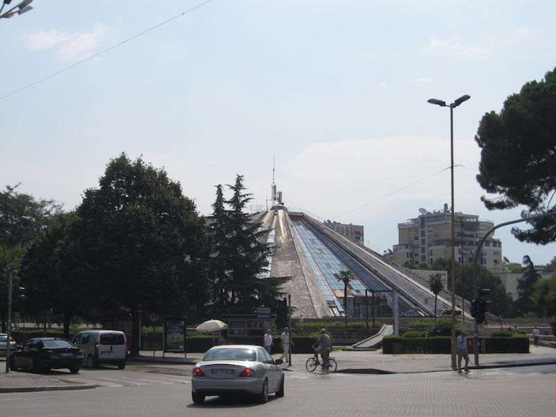 Tags drauf machten wir uns auf, das Gebiet südlich der Lana zu erkunden, des Flusses, der Tiranë in Ost-West-Richtung durchzieht. Da trafen wir zunächst auf die Ruine der Piramida, eines Bauwerks, das, von Pranvera Hoxha entworfen, 1988 als Enver-Hoxha-Museum eingeweiht worden ist und seit dem Ende des kommunistischen Regimes mehr und mehr verfällt.